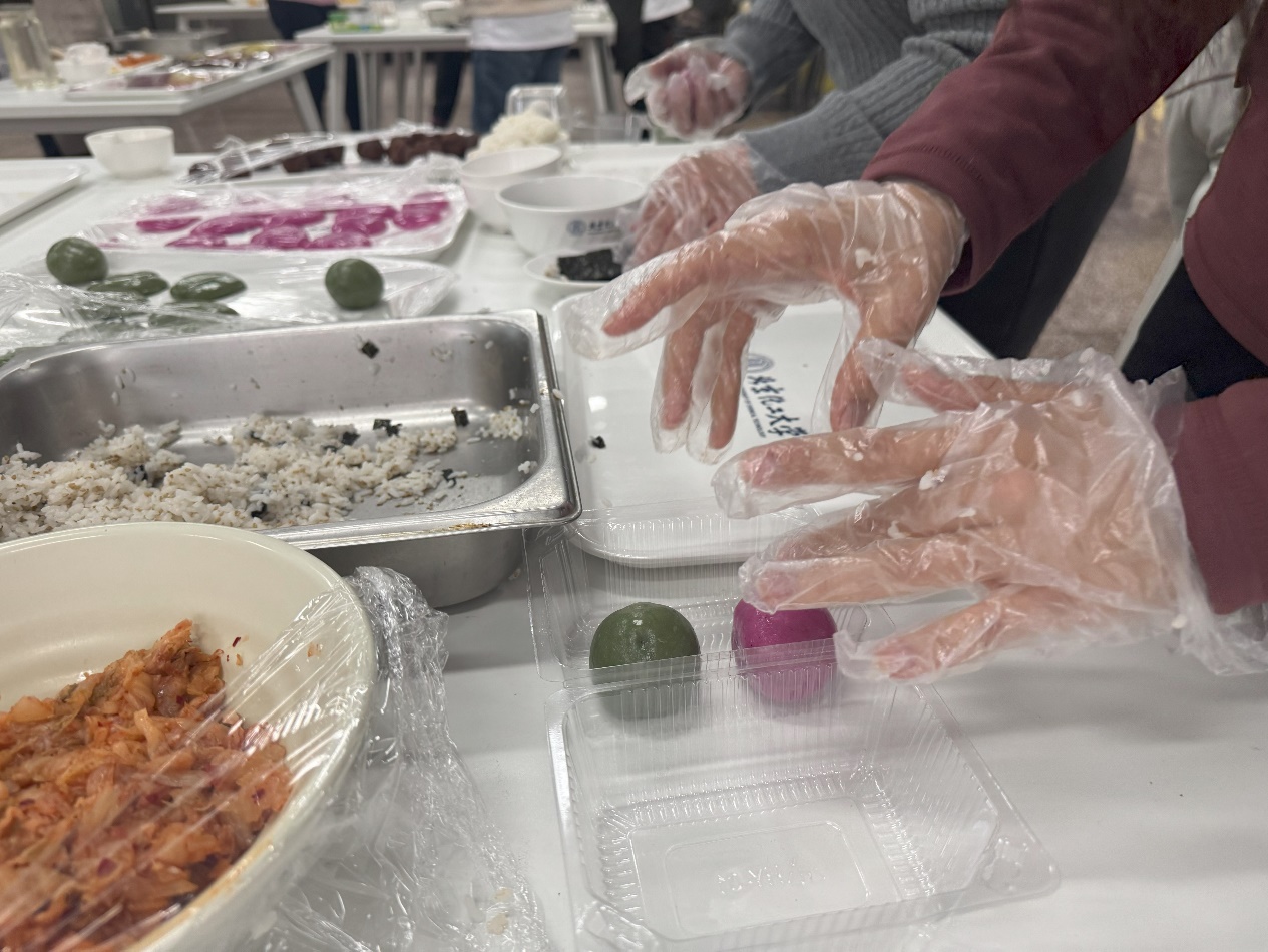 活动现场暖意融融,氛围浓厚,支部共建元素与服务育人理念贯穿始终。邀请的专业指导老师认真教学,详细讲解青团的起源与传统寓意、饭团的搭配技巧,随后一步步演示制作流程,耐心解答大家提出的疑问,细致指导每一个操作步骤。